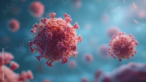 Coronavirus style virus with red spike proteins on blue cellular background, medical concept for science education, healthcare awareness