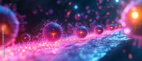 virus, disease, microscopic, cellular, infection, germ, microorganism, pink, blue, glowing, digital artwork, modern, dark, abstract, futuristic, biotechnology, biology, microbiology, scientific, medicals, health, pandemic, epidemic, contagion, disease, treatment, vaccine, research, laboratory, visual, graphic, illustration, render, closeup
