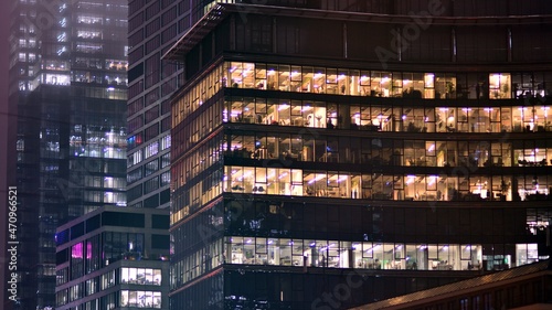 Corporate building at night - business concept. Glass wall office building .Modern office windows of skyscraper glowing at night.