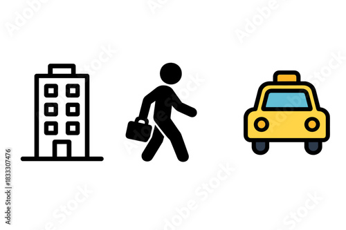 Corporate building, walking businessman with briefcase, and yellow taxi cab icons