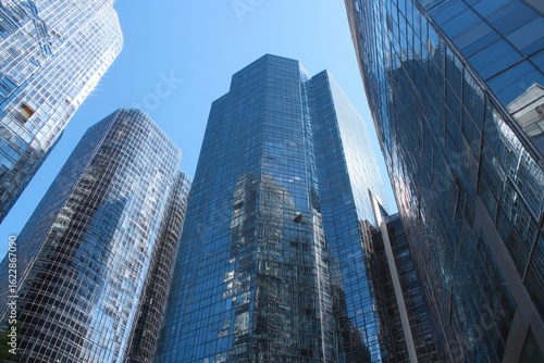 Corporate business district with reflective skyscrapers and office buildings, glass facade design under daylight, urban high-rise city skyline
