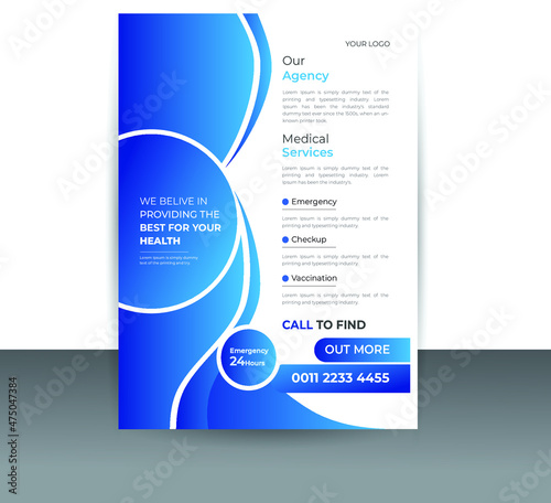 Corporate healthcare and medical cove a4 flyer design. Health layout concept. white background curve style. space for photo on top.