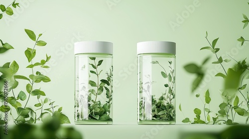 Cosmetic bottle containers with green herbal leaves, Blank label package for branding mock-up, Natural organic beauty product concept