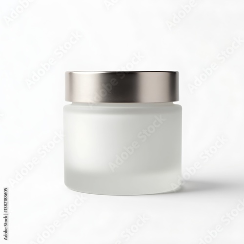 cosmetic cream container mockup, Frosted glass cosmetic jar with metallic lid, isolated on white background, ready for branding and customization