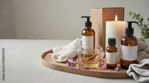 Cosmetic mockup with essential oils, cream, candle, and flowers for a calming self-care experience