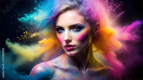 make-up, model, fashion, beauty, woman, face, make-up, lip, art, studio, people, person, cosmetic, brush, powder, dust, colourful, black, advertisement