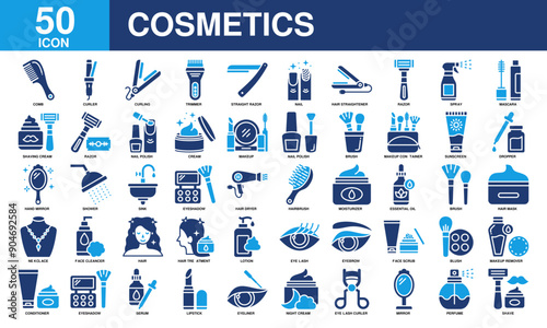 Cosmetics icon collection set. Containing makeup, beauty, skincare, makeup equipment, beauty and cosmetics, beauty treatment, makeup tool icon. Simple color fill vector.