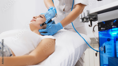 Cosmetologist doing hydrafacial treatment on woman face in beauty clinic