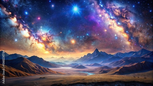 Cosmic landscape with mountains, valleys, and stars in the distance, starry night, space, cosmos