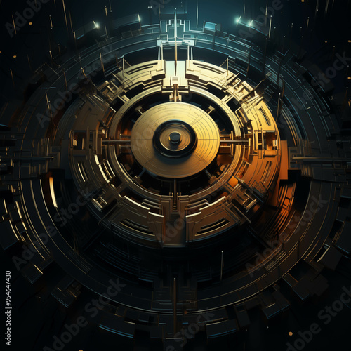 futuristic, technology, space, abstract, design, science fiction, machine, mechanical, engineering, detail, intricate, complex, gold, metal, dark, background, circle, symmetry, pattern, industrial, structure, time, clockwork, gear, cog, future, innovation, power, energy, alien, civilisation, unknown, exploration, mystery, cosmic, universe, galaxy, celestial, digital artwork