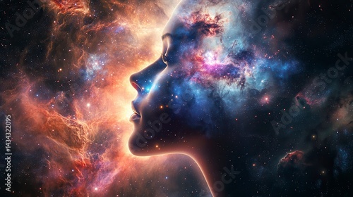 woman, face, profile, head, nebula, space, cosmos, universe, galaxy, star, night, sky, colourful, vibrant, mystical, magical, spiritual, energy, power, light, dark, abstract, art, design, illustration, fantasy, dream, imagination, surreal, cosmic, celestial, aethereal, mysterious, wonder, awe, beauty, feminine, wisdom, cognition, soul, mind, inner, peace, serenity, spiral, astronomy, deep