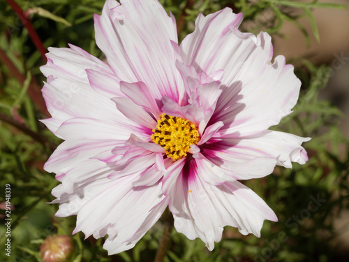 (Cosmos bipinnatus) Wunderschöner Schmuckkörbchen mit weißen doppelte Blütenblättern mit rosa Tönen