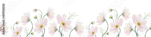 Cosmos flowers and leaves. Isolated hand drawn watercolor seamless border of pink wildflowers. Summer floral banner for wedding invitations, cards, packaging of goods
