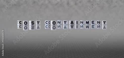 cost containment word or concept represented by black and white letter cubes on a grey horizon background stretching to infinity