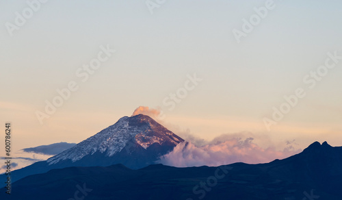 Cotopaxi volcano with smoke volcanic activity at sunset, Cotopaxi national park, Ecuador.