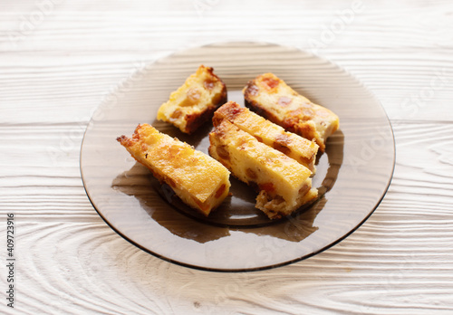 Cottage cheese casserole with raisins filling.