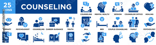 Counseling icon collection set. Containing design, Counseling, Mental Health Care, Therapy Session, Counselor Office, Emotional Healing
