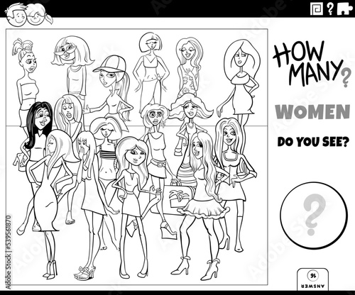counting, how many, puzzle, education, cartoon, illustration, workbook, game, calculation, number, mathematic, mathematic, preschool, activity, task, colouring, page, book, black, white, vector, woman, girl, people, lifestyle, young, beautiful, beauty, pretty, comic, character, group, riddle, estimate, design, learning, solution, drawing, graphic
