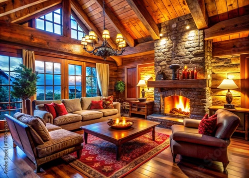 Country Hunter Chalet Fireplace Interior Design AI Photo - Cozy & Bright