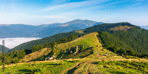 countryside mountain landscape on a sunny morning. beautiful view in to the distant hill and valleys with fog in summer