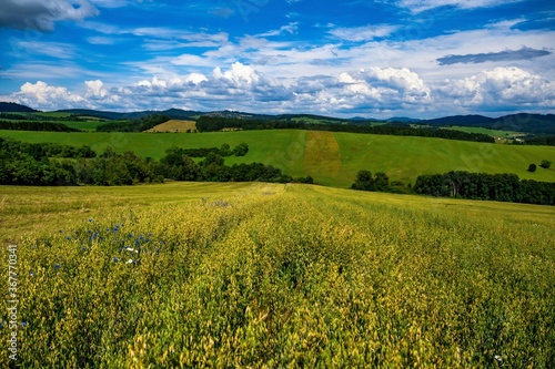 Countryside with wide oat fields, green meadows and blue hills, blue sky and white clouds on horizon in summer sunny day. Landscape near village Lacnov, Moravia, Czech republic.