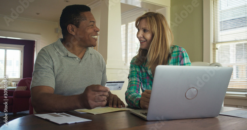 couple, man, woman, laptop, buying, happy, joy, laughing, smiling, booking, trip, vacation, travel, plan, planning, computer, laptop, bill, finance, budget, debt, credit, paying, loan, purchase, retirement, bank, tax, pay, online, home, black, white, african american, caucasian, mature, senior, 50s, 60s, people, person, two people, husband, wife, marriage, female, male, together, retired