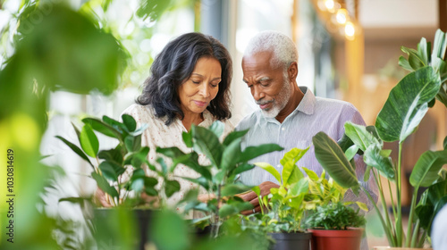 couple, american, gardening, home, plant, green, senior, elderly, mixed, race, multiracial, latin, hispanic, mature, activity, leisure, hobby, asian, potted, mental, health, indoor, bright, background, together, happy, people, colours, nature, adult, well-being, age, diversity, retirement, retired, pensioner, smiling, care, spouse, bonding, growth, lifestyle, joy, natural, love, greenery, floral, garden