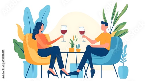 cheer, lounge, togetherness, human relationships, chair, joyful, romance, enjoyment, positive, friendship, indoor, goggles, minimalist, wine, smiling, intimacy, simple, whimsical, red wine, digital artwork, eatery, bar, love, fun, toast, couple, happy, illustration, modern art, cartoon, white, art, character, blue, graphic design, celebration, colourful, yellow, casual attire, green, bright, plant, table