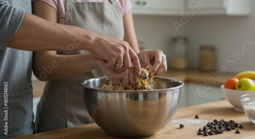 cooking, kitchen, dough, baking, bowl, couple, food, hand, table, ingredient, dessert, apron, homemade, mixing, receipe, preparation, together, lifestyle, countertop, indoor, love, sweet, cookie, oatmeal, chocolate, chips, fruit, banana, orange, sugar, flour, family, house, domestic, human relationships, person