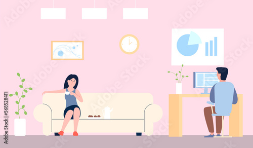 vector, routine, home, couple, daily, illustration, woman, man, character, cartoon, family, young, together, everyday, person, people, lifestyle, morning, scene, girl, female, male, happy, life, house, design, room, husband, adult, work, wife, concept, human relationships, rest, apartment, relax, guy, leisure, sitting, relaxation, interior, sofa, hot drink, computer, surfing, enjoy, indoor, graphic, living