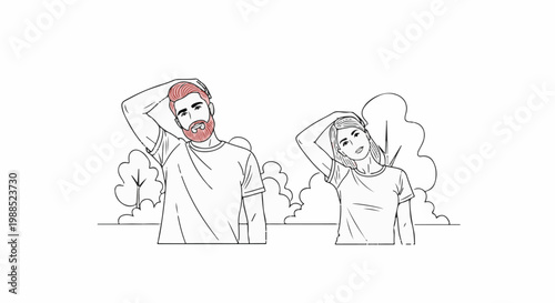couple, man, woman, stretching, neck, exercise, outdoors, nature, bush, tree, health, fitness, lifestyle, well-being, relaxation, freedom, connection, partnership, joy, happiness, love, human relationships, activity, movement, fresh, air, morning, day, sun, bright, simple, clean, line, art, illustration, drawing, vignetting, modern, minimalist, graphic, design, creative, artistic, people, pair, together, healthy