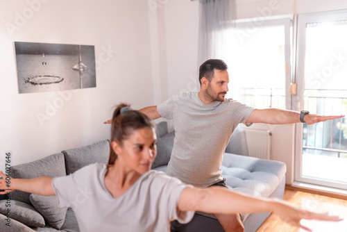 couple, physical exercise, fit, fitness, exercise, training, yoga, healthy, lifestyle, home, online, course, leisure, athletic, active, relaxation, young, 2, people, person, indoor, sport, health, vitality, stretching, happy, bodycare, exercising, recreation, practice, girl, beautiful, photogenic, woman, man, caucasian, routine, together, apartment, boyfriend, girlfriend, activewear