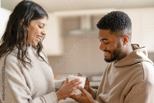 Couple enjoying warm drinks together in a cozy kitchen during winter
