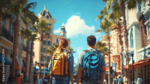 Couple Exploring Sunny Tropical City Street Palm Trees Backpacks Vacation Travel