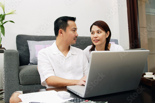 asia, asian ethnicity, home, black hair, communication, couple, day, discussing, document, horizontal, indoor, laptop, living room, long hair, looking away, man, mature adult, man, moustache, shirt, side by side, sitting, smiling, sofa, straight hair, table, togetherness, two people, woman, woman, photo