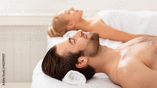 couple, massage, spa, man, woman, lying, eyes closed, relax, treatment, wellness, resting, romantic, enjoy, rejuvenation, relaxation, body, young, care, skincare, salon, people, well-being, white, concept, guy, caucasian, therapy, background, resort, indoor, vacation, 2, procedure, adult, male, lifestyle, honeymoon, female, towel, relaxed, smiling, healthy, lady, beauty, relaxing, bed, skin, pampering