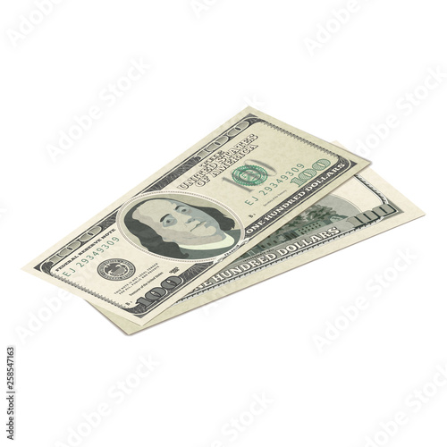 Couple of fake one hundred USA dollars banknote, front and back detailed coupure in isometric view on white