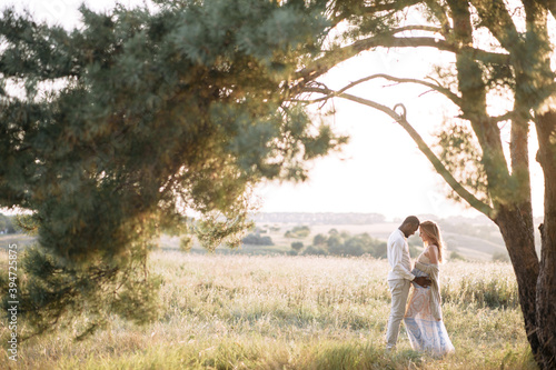 multiracial, diverse, diversity, togetherness, affectionate, embracing, married, touching, hope, eltern, wife, dreaming, husband, human relationships, fertility, father, femininity, african, american, bonding, pregnancy, smile, abdomen, biracial, male, romance, mother, people, life, happiness, love, enjoyment, family, tranquil, couple, pregnant, standing, man, care, baby, holding, caucasian, black, meadow, nature, summer, tree, beautiful