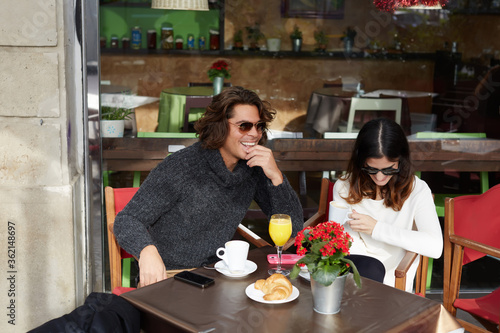 Couple of good friends met by chance in the street sat sidewalk cafe at cool autumn day happily discuss all the latest news in their lives while they enjoying cup of coffee and fresh juice breakfast