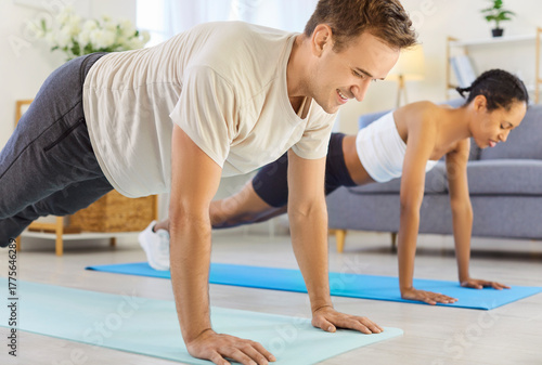 Couple plank workout exercise together at home. They focus on core fitness, using training on yoga mats, sharing support in a clean bright room. Family health, unity, and motivation.