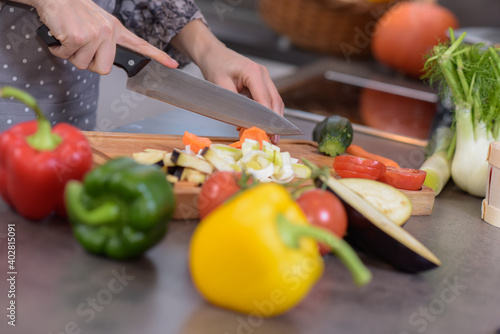 food, kitchen, cooking, vegetable, salad, healthy, vegetable, cutting, tomatoes, knife, woman, fresh, pepper, chef, red, preparing, vegetarian, cook, diet, hand, green, meal, cut, dinner, hand