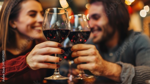 Couple sharing an intimate moment over red wine, toasting to their relationship. Perfect for romantic promotions and festive dining experiences.