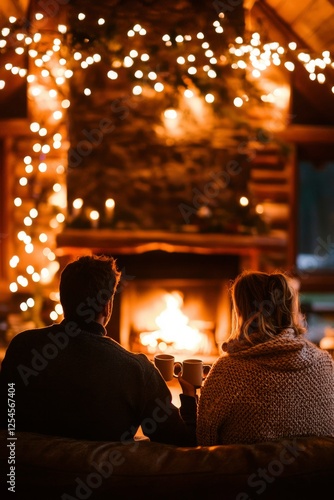 Couple sips coffee by warm fireplace in cabin with lights. Cozy winter scene