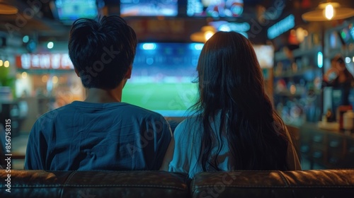couple, bar, television, game, watching, sitting, screen, television, sport, night, eatery, entertainment, people, together, love, date, back, female, male, dark, nightlife, brown, leather, couch, sofa, blurry, background, light, bright, shadow, indoor, relaxed, sharpened, relaxation, enjoying, atmosphere, friends, casual attire, fun