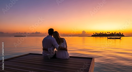 couple, sunset, ocean, sunrise, beach, pier, romantic, love, honeymoon, travel, vacation, holiday, tropical, island, silhouette, maldives, sea, water, sky, human relationships, togetherness, peaceful, serenity, calm, relaxation, evening, golden hour, happy, blissful, picturesque, paradise, landscape, ocean view, nature, adventure, health, wellness, conceptual