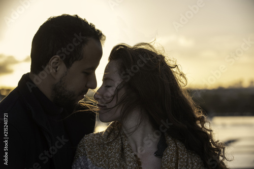 couple, heterosexual, lover, human relationships, romance, romantic, dating, standing, face to face, affectionate, love, paris, france, foulard, coat, togetherness, bonding, connection, vacation, travel, tour tourism, lifestyle, travel destination, two people, young adult, man, male, woman, female, outdoors, sunset, photo, horizontal, head shot, closeup, color image