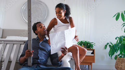 Couple With Pregnant Woman Looking At Instructions For Self Assembly Baby Cot