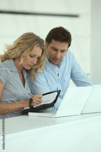 couple, colleague, husband, man, male, wife, woman, female, human relationships, love, thinking, concentrating, working, writing, brown, dark, blond, fair, hair, laptop, diary, agenda, schedule, caucasian, white, portrait, closeup