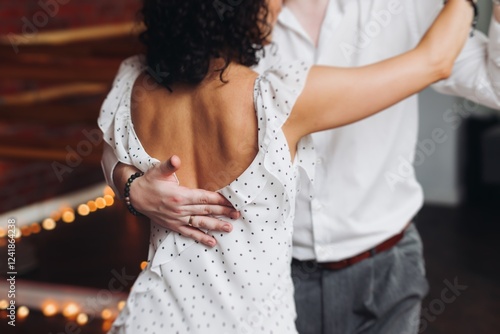Couples dancing traditional latin argentinian dance milonga in the ballroom, tango salsa bachata kizomba lesson in red and purple lights, performance rehearsal, evening dance school class festival