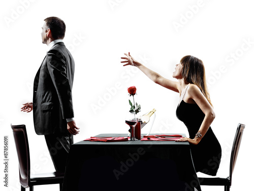 separation, problem, challenged, couple, dinner, eatery, people, silhouette, isolated, backlit, meal, shadow, studio, white background, arguing, leaving, conflict, issue